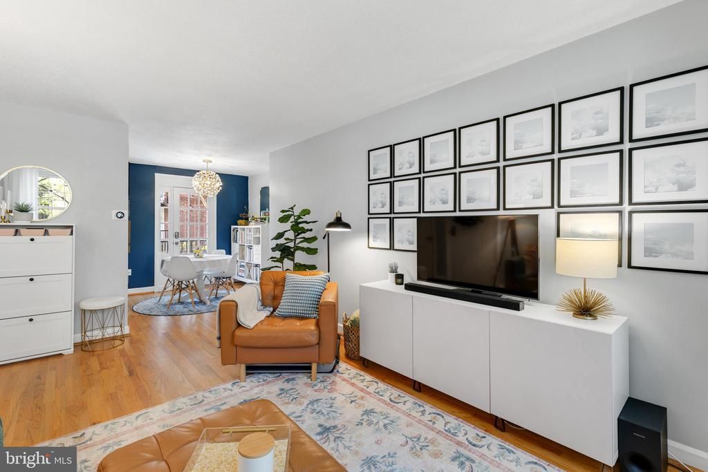 Gorgeous 1-bedroom, 2-bathroom Barcroft model home nestled in sought-after Fairlington Villages! A welcoming front entry with a convenient coat closet opens into the spacious main living area, featuring hardwood flooring & neutral paint throughout. The dining area is accented with a modern chandelier & offers direct access through a French door to the back balcony and private fenced-in brick patio - a fantastic space for relaxing or entertaining. The kitchen showcases tile flooring, updated soft-close white cabinetry, granite countertops, over-sink lighting, & new stainless steel refrigerator (2025), stainless steel dishwasher (2026), & microwave (2026). The main-level bathroom features tile flooring, a stone-topped vanity, a medicine cabinet mirror, & a sparkling white tiled shower. The primary bedroom offers a comfortable & well-designed retreat with built-in nightstands & sconce lighting, a large armoire featuring recessed accent lighting & two closets including a walk-in with a dresser that conveys. The carpeted lower level expands your living space with a versatile bonus room with pocket door at the bottom of the stairs - perfect for guests or a home office. The hallway includes two large armoires with recessed accent lighting, as well as a linen closet for added storage. The renovated lower-level bathroom (2024) features tile flooring, a glass-enclosed tiled shower with a rainfall showerhead, & a modern white vanity. The huge recreation room offers incredible flexibility as a second living area, media space, or workout room, & includes a separate entrance. A utility/storage/laundry room completes the home with a full-sized washer & dryer, a new water heater (2025), and a newer HVAC system (2022) with newly added EnviroAire Dual Lamp UV air purifying system (2025). This home includes two reserved/unassigned parking spaces. Fairlington Villages residents enjoy exceptional amenities including six pools, lighted tennis courts, tot lots/playgrounds, and walking paths. Ideally located near I-395 and just minutes to The Village at Shirlington, West Alex, Baileys Crossroads, Del Ray, and Old Town - offering unbeatable convenience to shopping, dining, and commuting options.